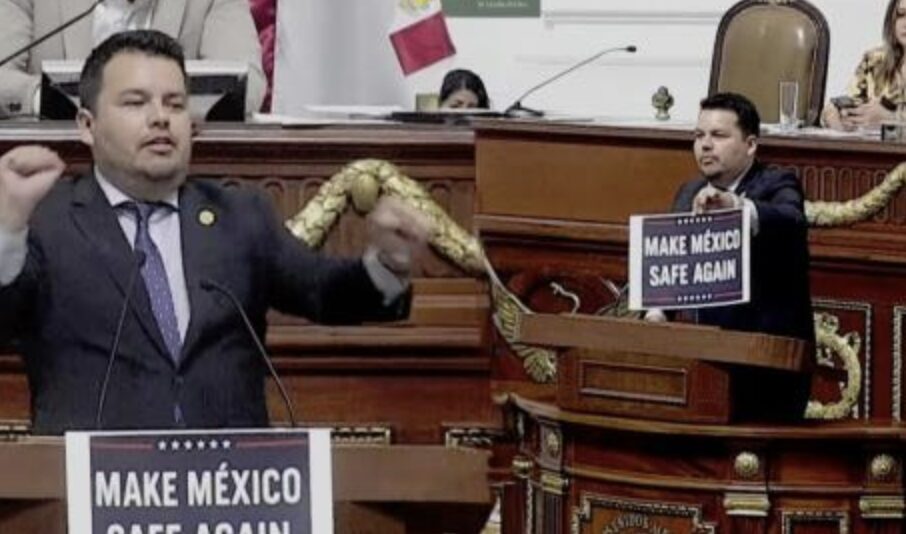 Al finalizar, Torres colocó en la tribuna una pancarta con la frase “Hagamos México seguro de nuevo”, una clara referencia al lema de campaña de Trump. Acto seguido, imitó los pasos de baile del mandatario republicano, gesto que desató reacciones encontradas entre los presentes.